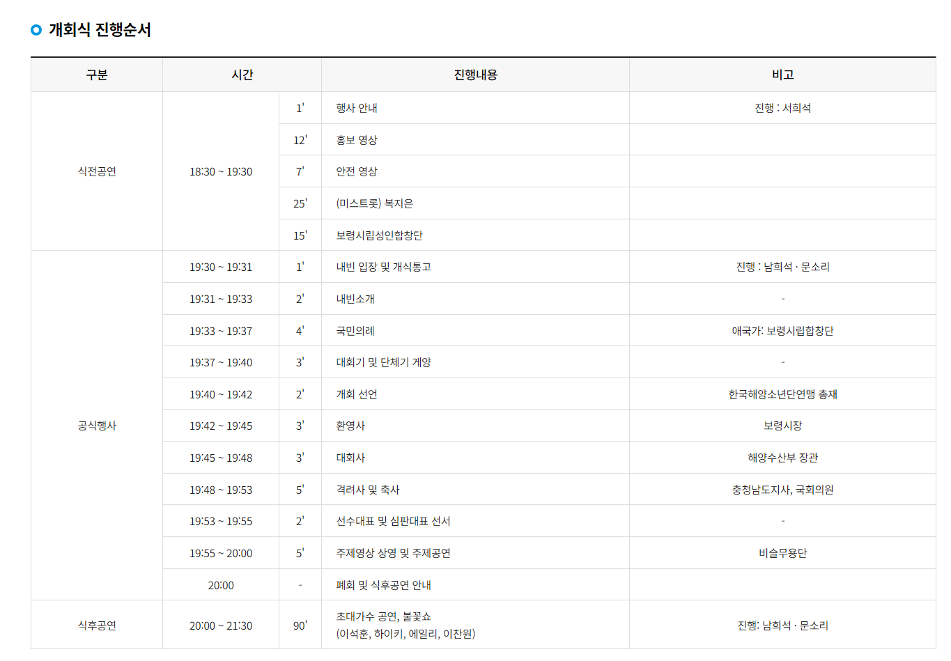 개회식 : 7.31 (수) 19:30 ~ 21:30 대천해수욕장 분수광장 특설무대