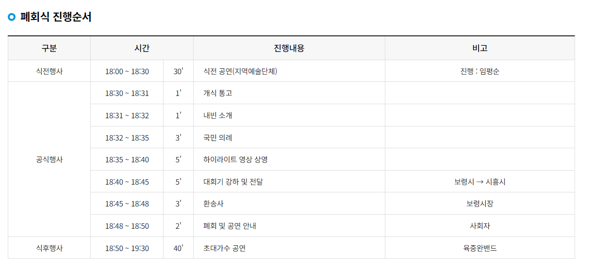 폐회식 : 8.3 (토) 18:30 ~ 19:30 대천해수욕장 분수광장 특설무대