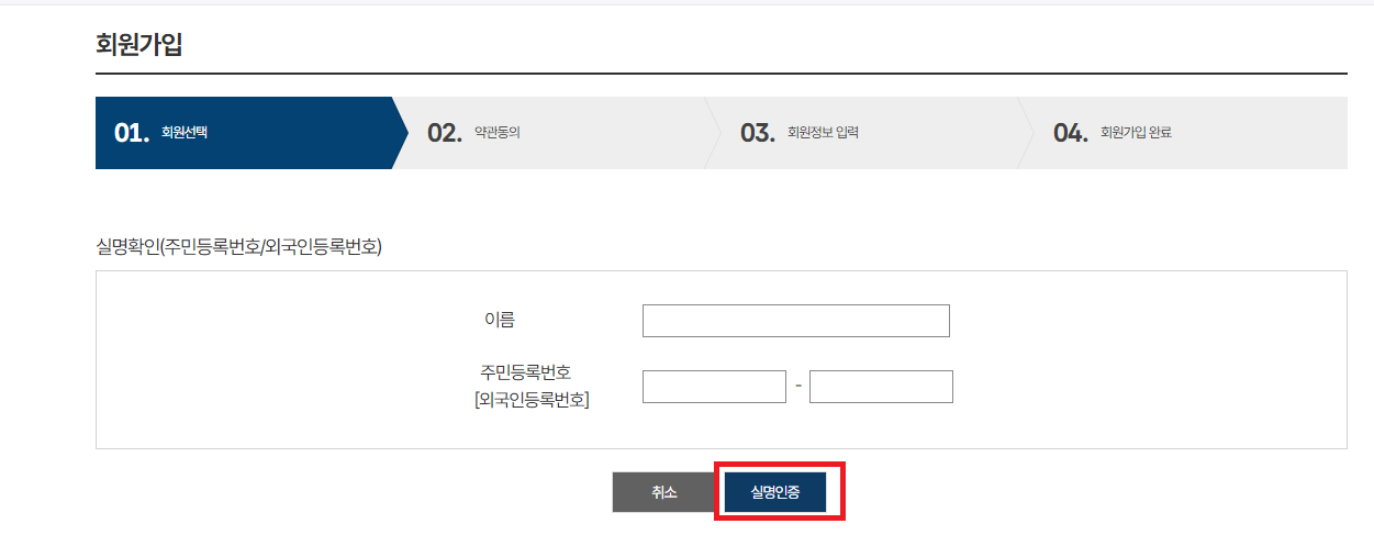 3. 개인으로 회원가입 들어가시면 이름과 주민등록번호를 입력하시고 실명인증을 하셔야 합니다.